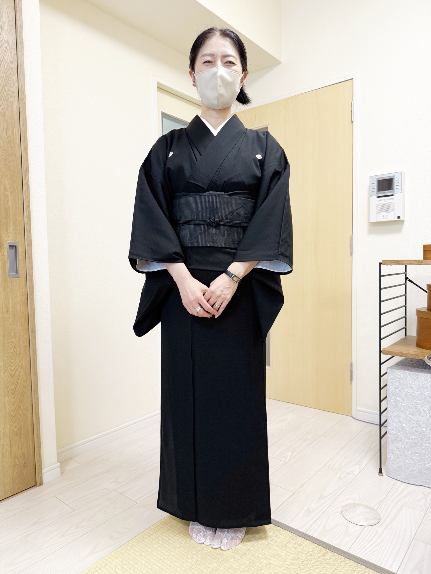 黒喪服の着物姿。五つ紋入りで上品な着姿。