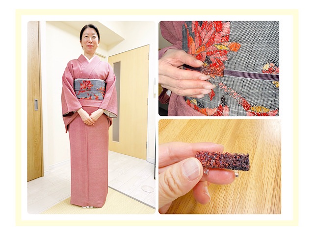 3. 色大島紬と、仕立て直した名古屋帯(袋帯をカット)を合わせてコ…
