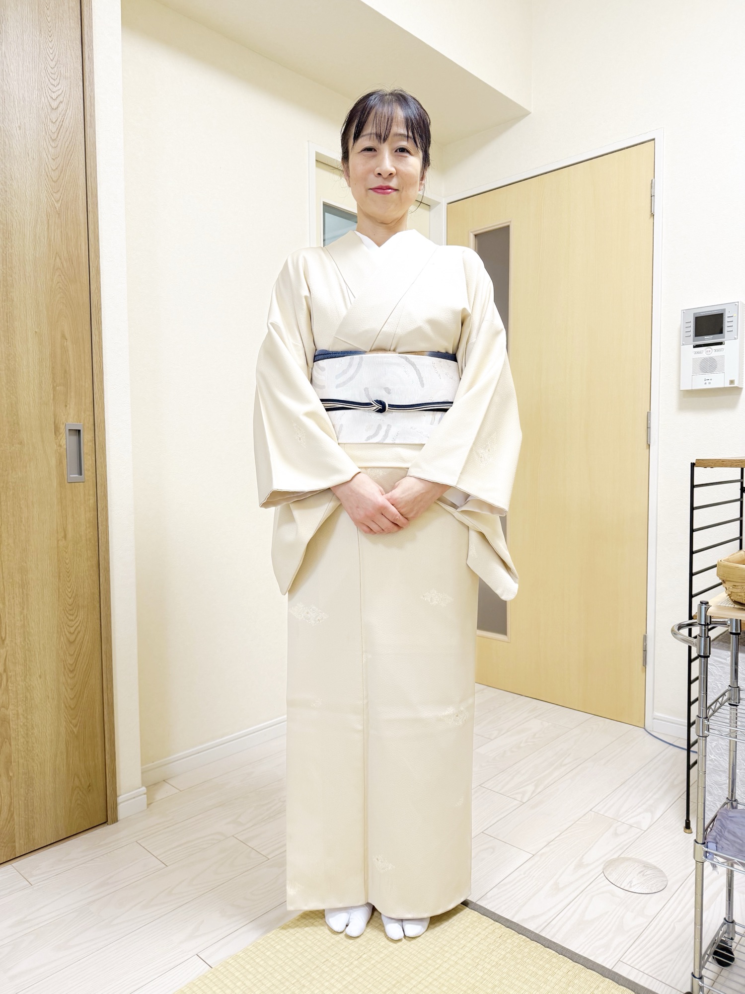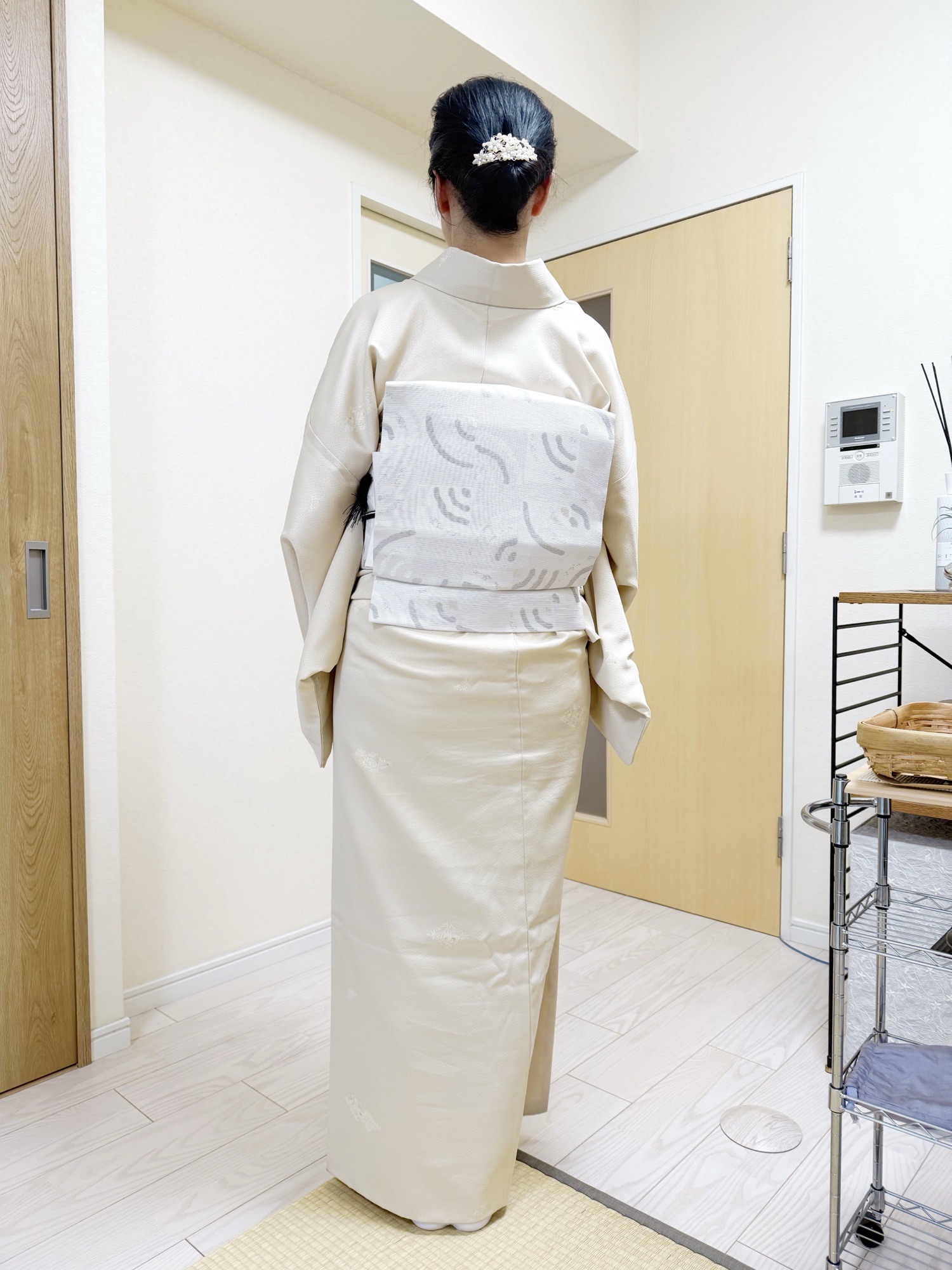 淡い薄ベージュ色の小紋に白地名古屋帯。