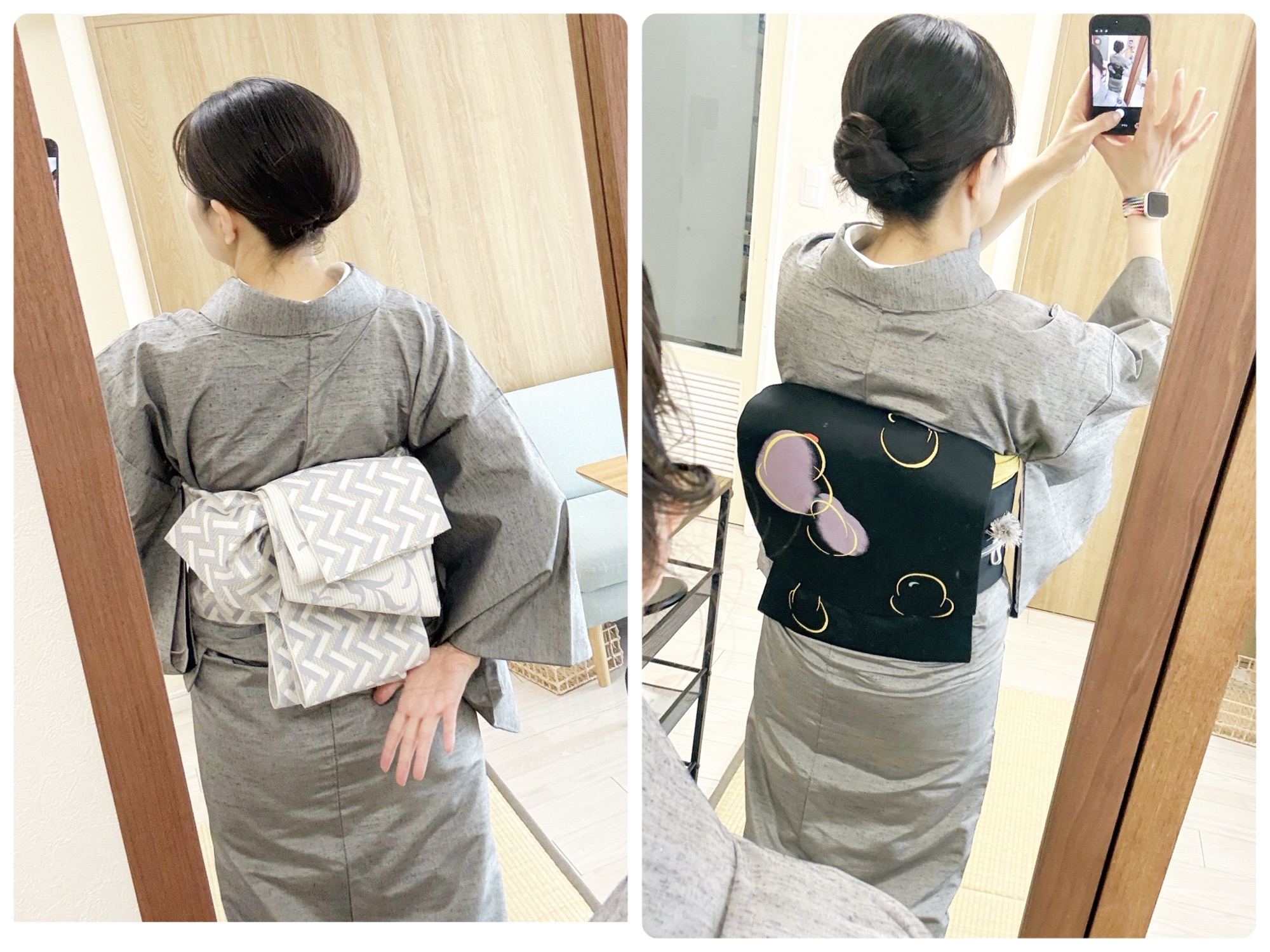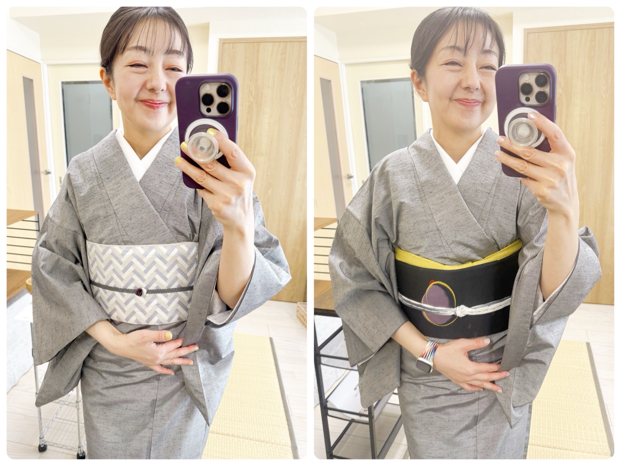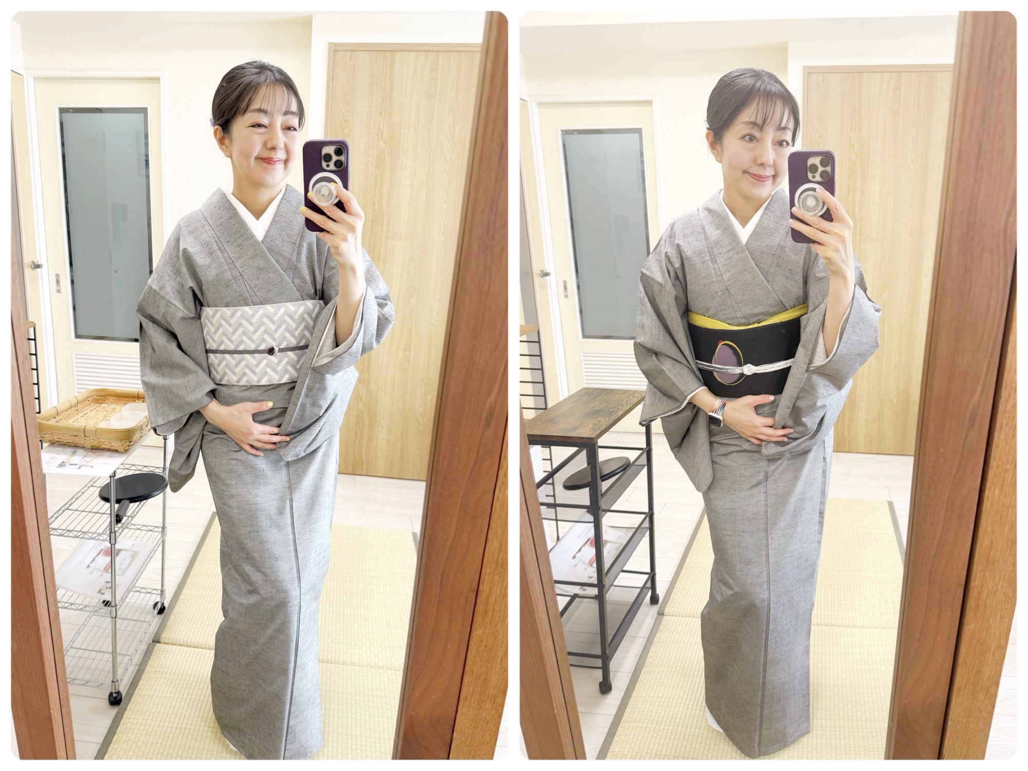 同じ紬でもここまで変わる!細帯と名古屋帯で楽しむグレーの着物コーデ
