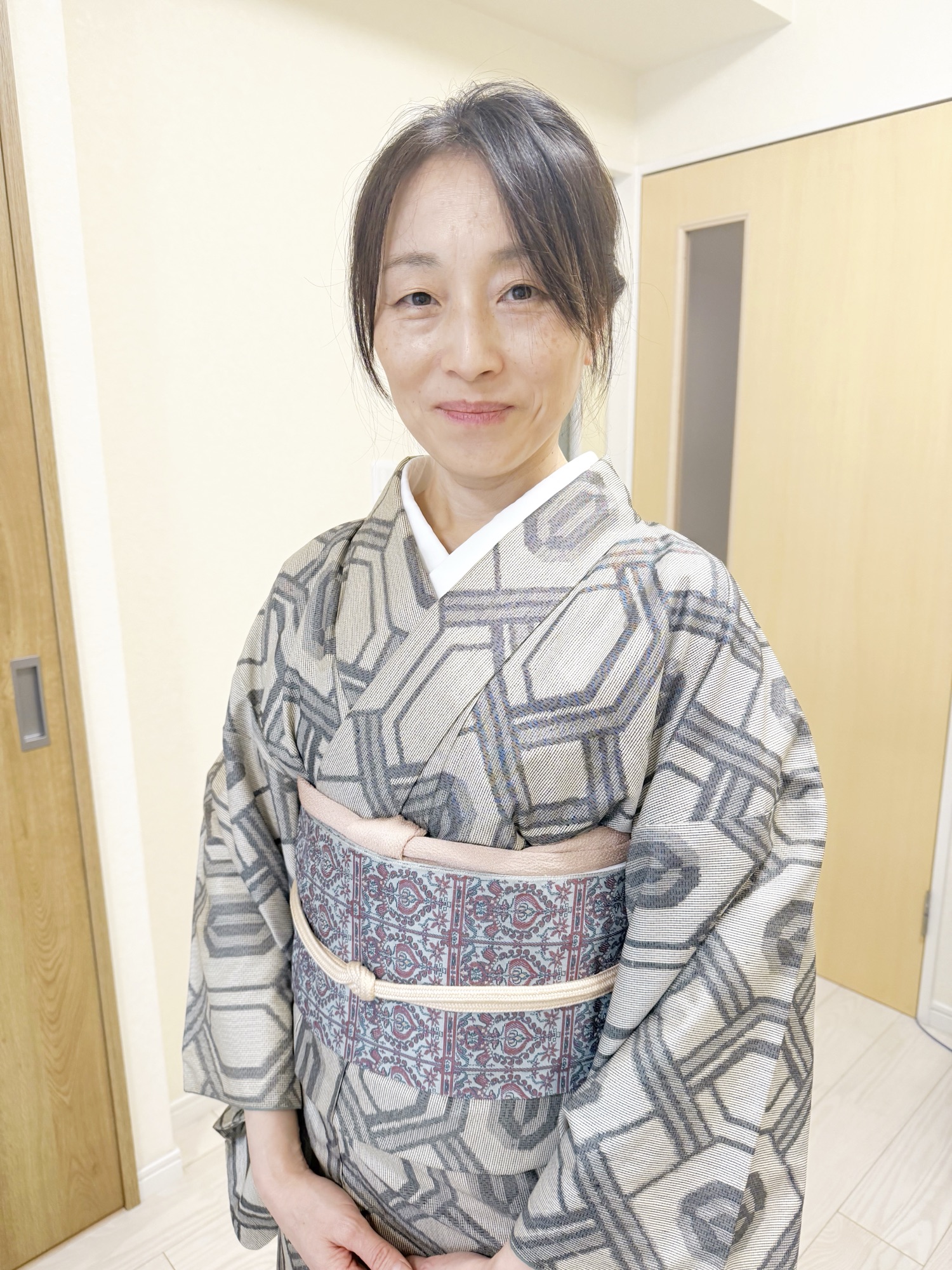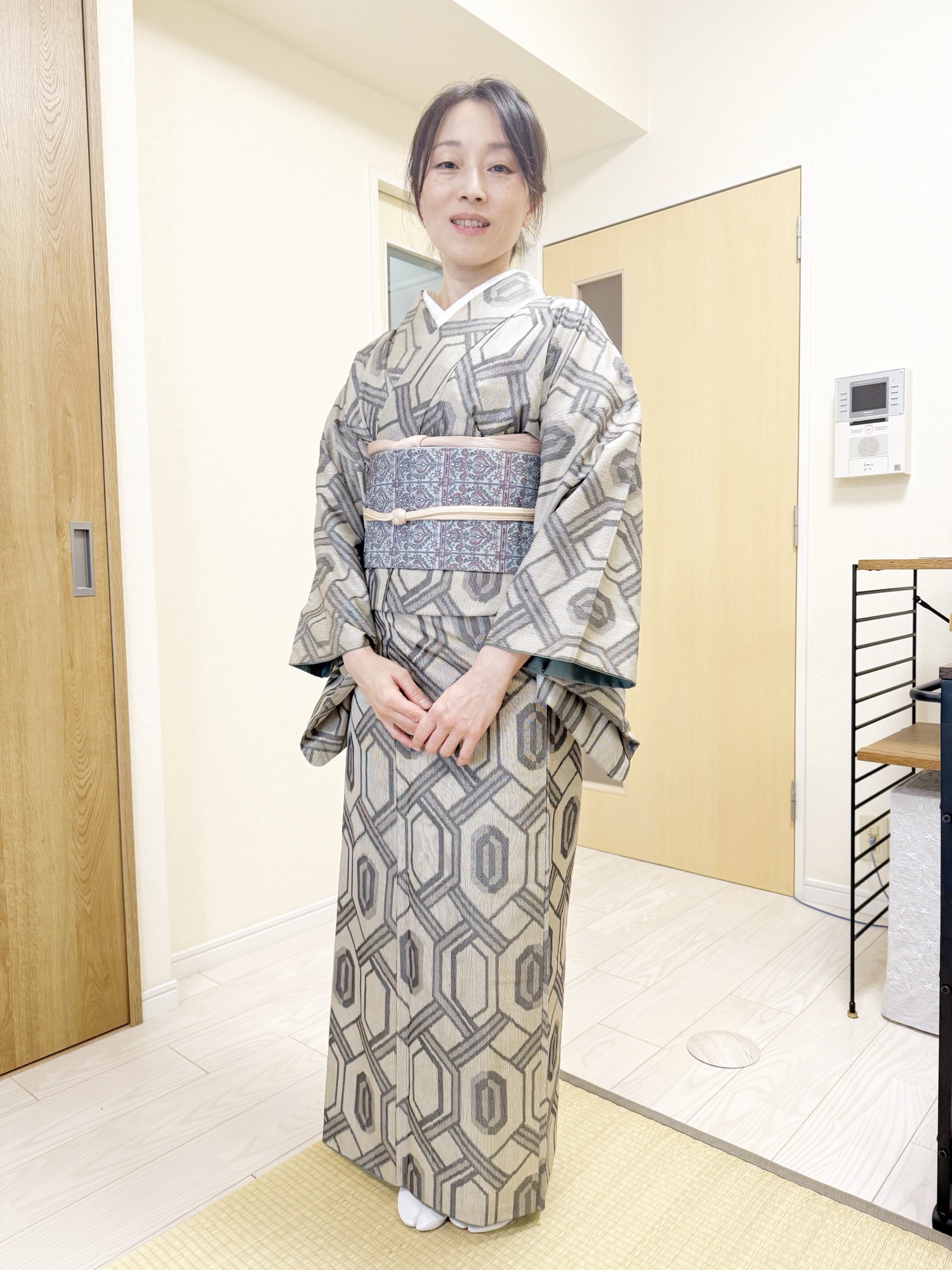 お着物は大島紬、亀甲柄が印象的ですね✨