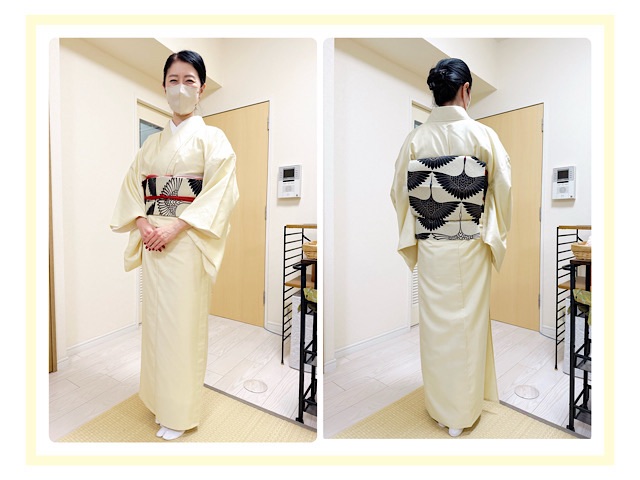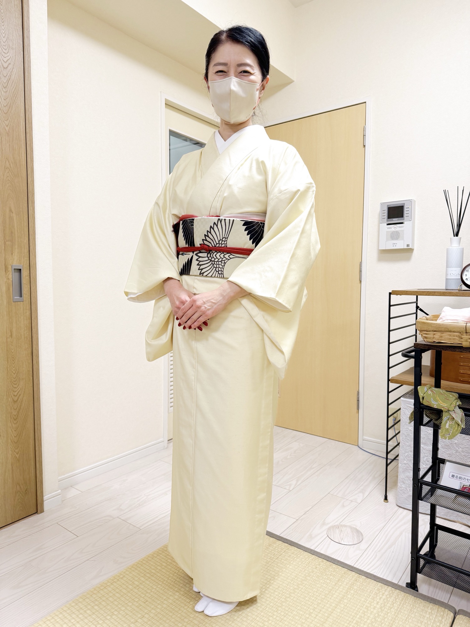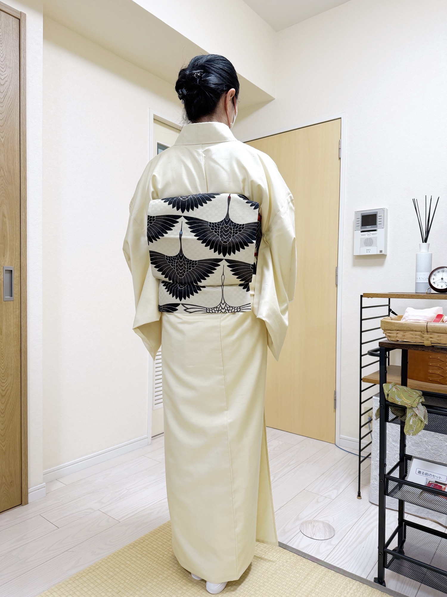 レモン色の牛首紬に鳥さん柄の名古屋帯、