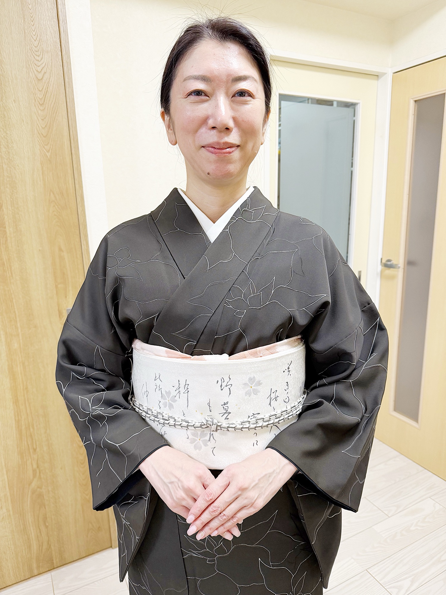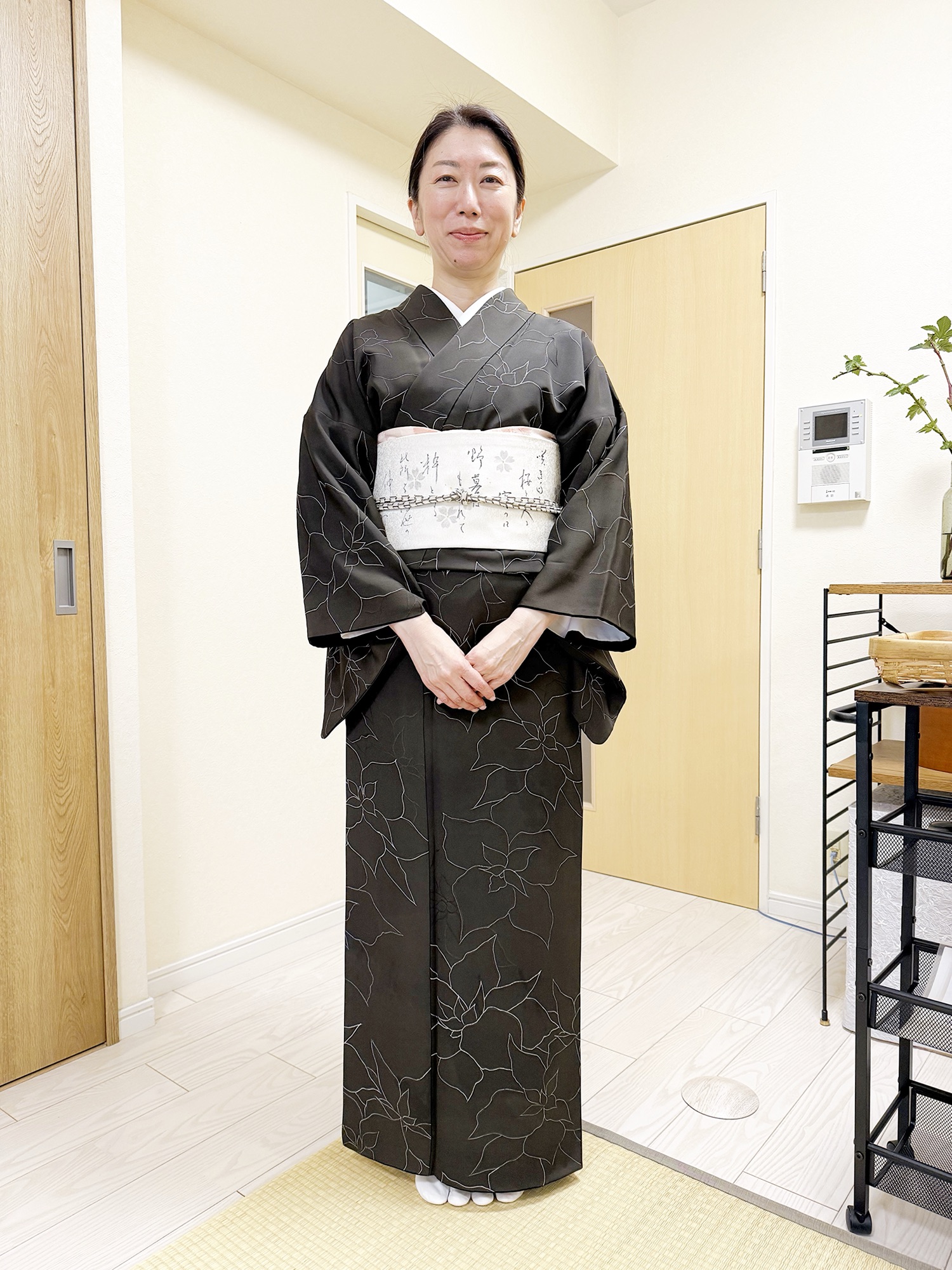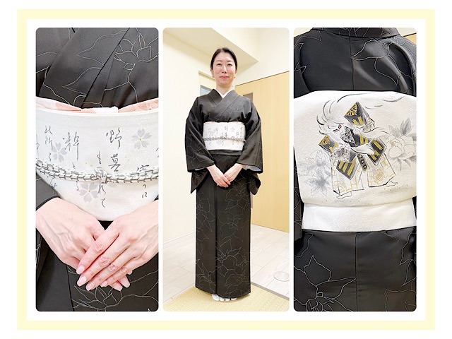 生徒様お気に入りの1枚、墨色の細線花柄小紋に