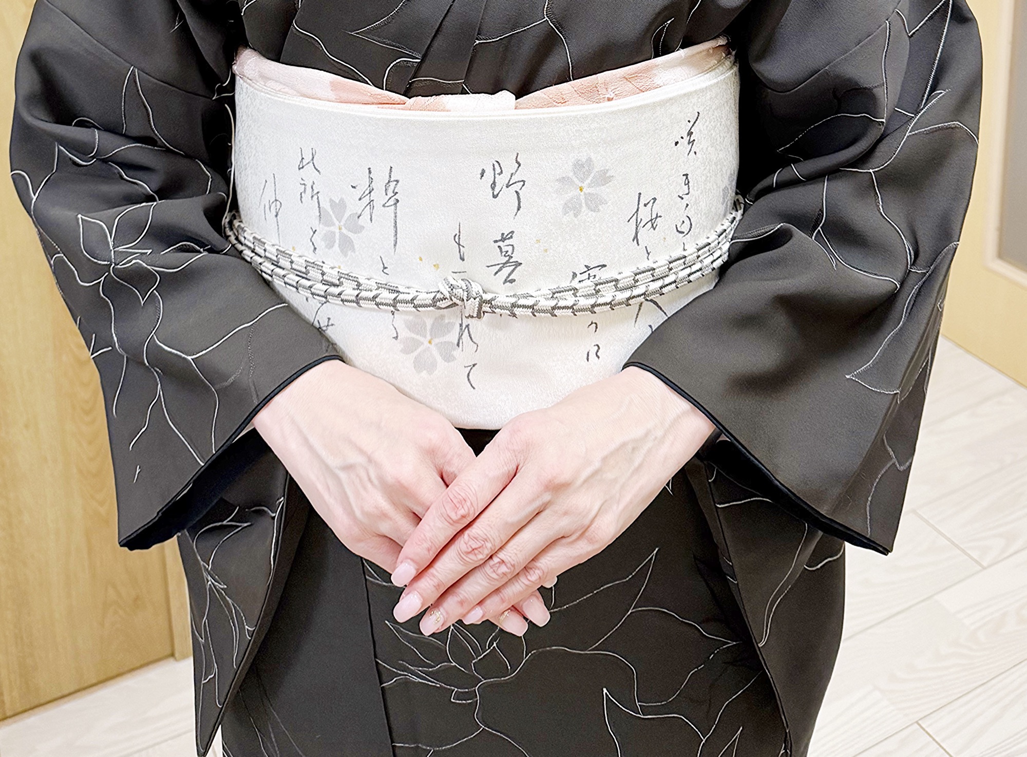 墨色の着物と白い帯の間を、