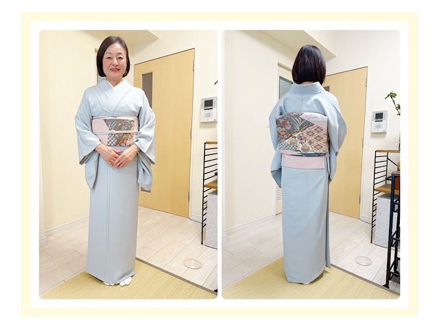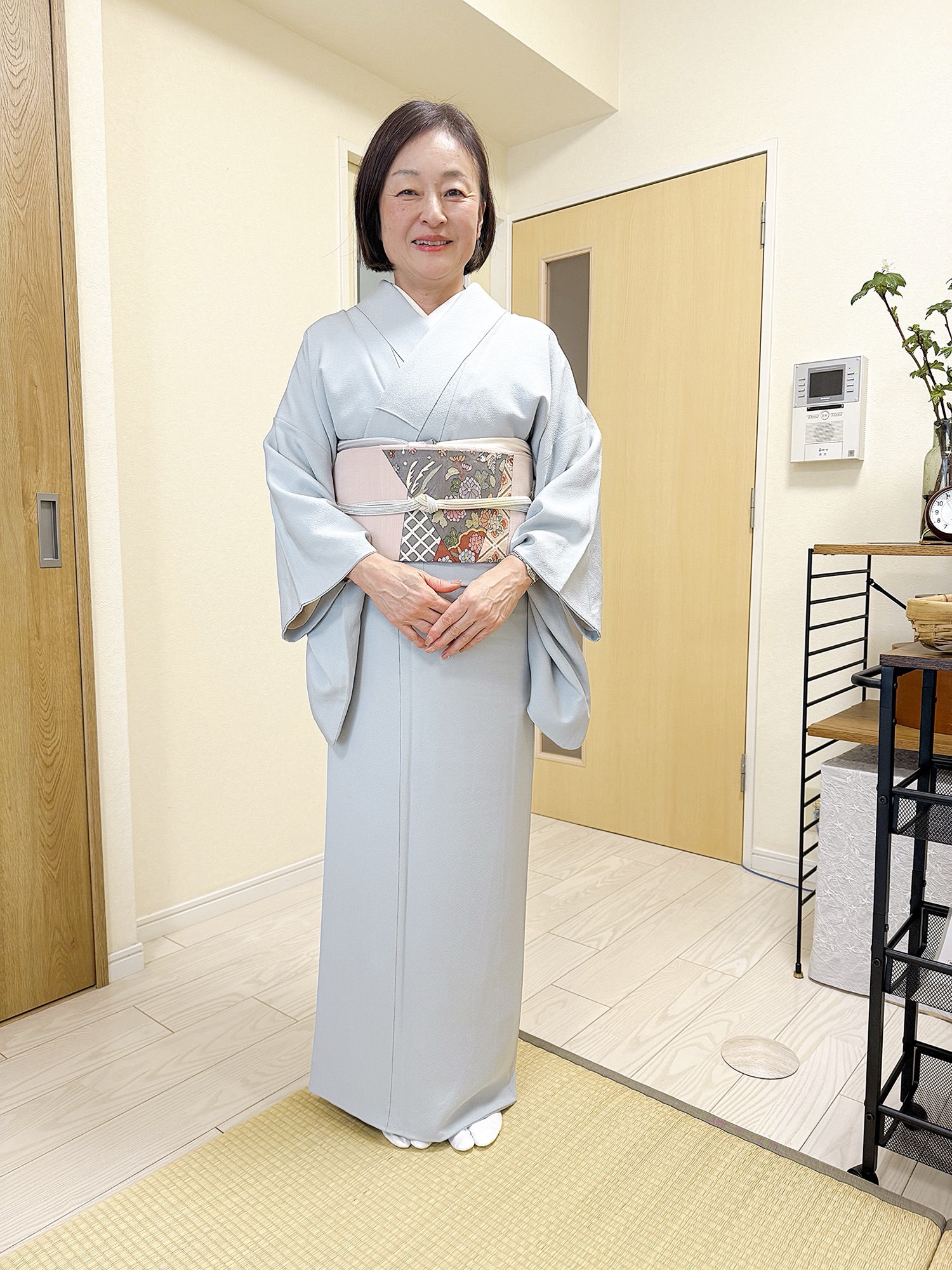 淡い水色の一つ紋色無地で楽しむ着物コーデ|観劇にもお食事にも✨