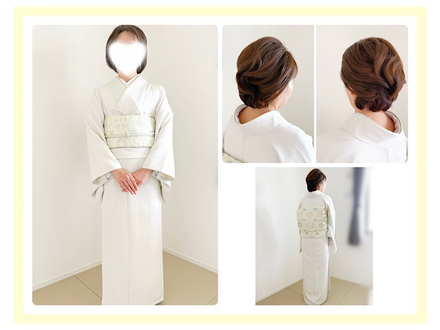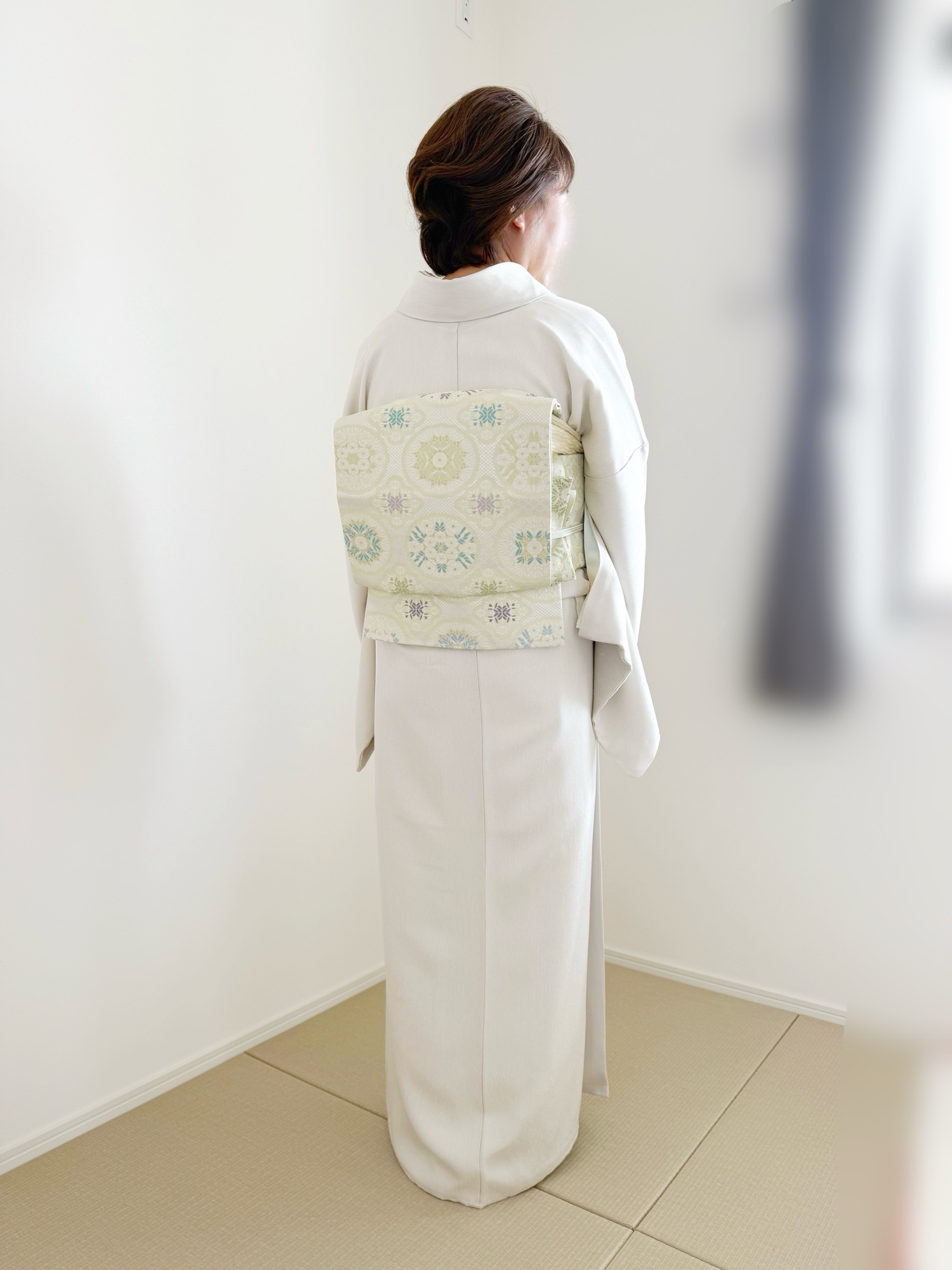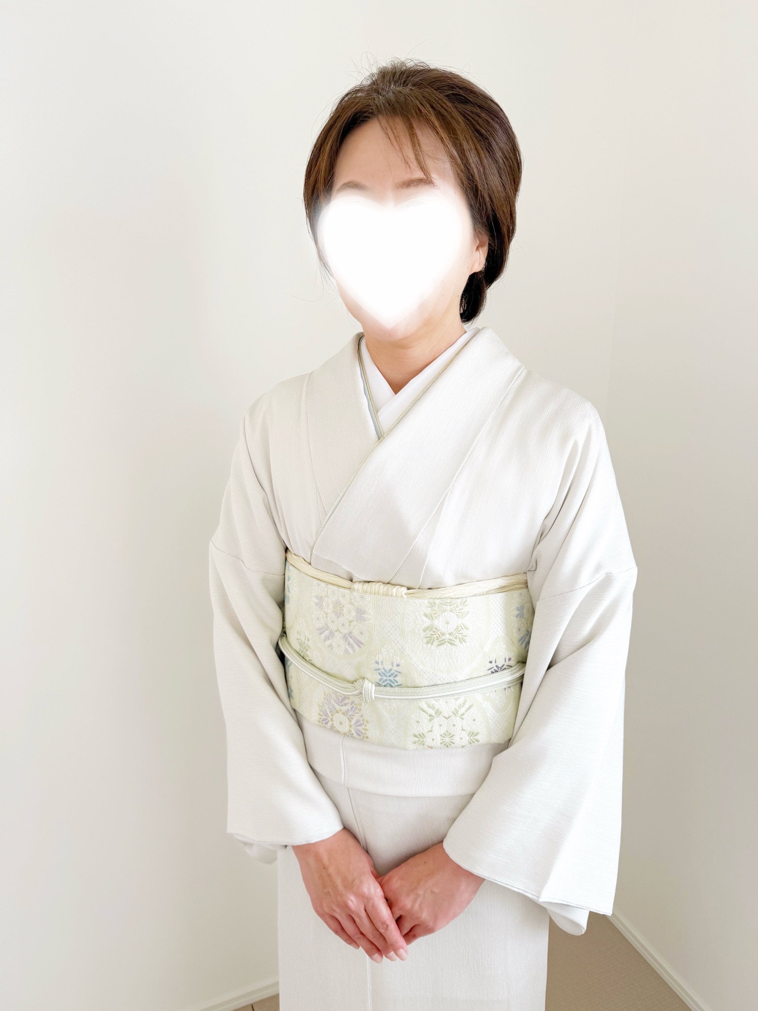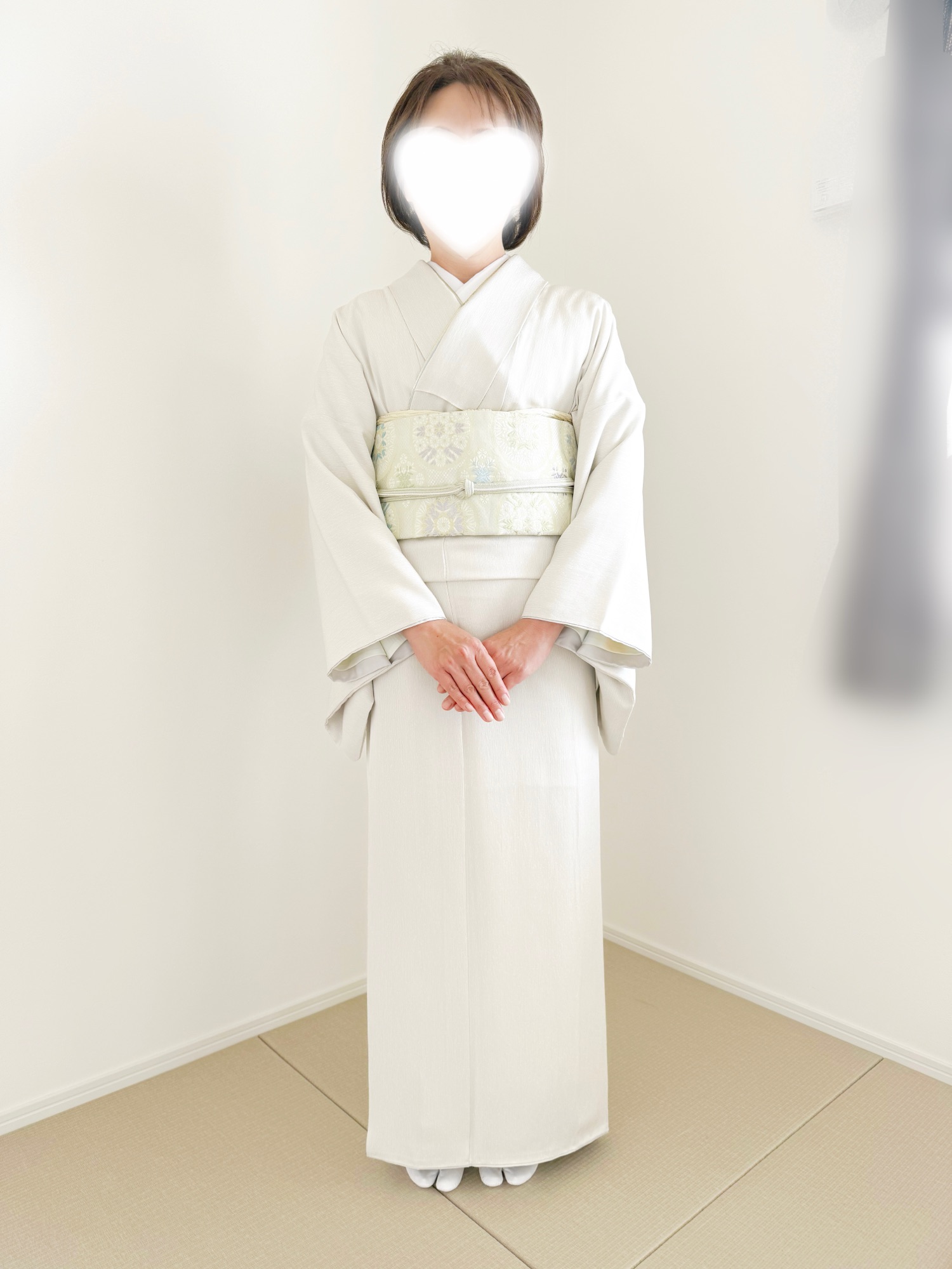 柔らかなオフホワイトの御召と、爽やかなミントグリーンの調和