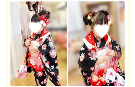赤のお被布が愛らしい3歳さん七五三着付けとヘアセット|佃・住吉神社へ【出張着…