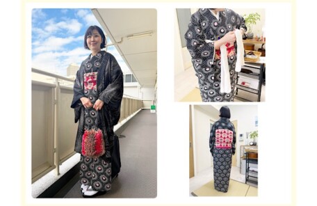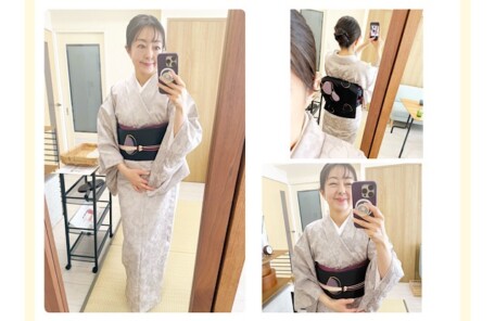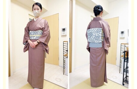 絞りの墨色小紋にピンクの名古屋帯が映える、生徒様の着物コーデとレッスン風景