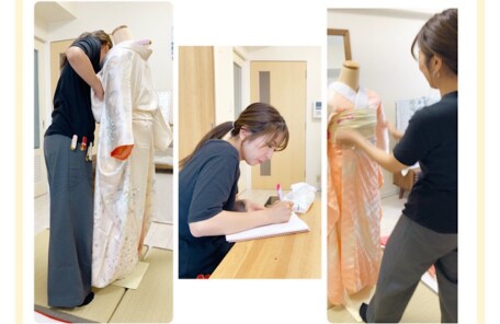 他装(振袖)コースの生徒様の練習風景、「命」の補整、長襦袢、そして着物裾合わ…