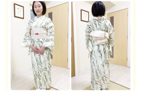 【ご自宅訪問レッスン録】茄子ときゅうりの丸文柄紗小紋と半幅帯で!