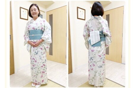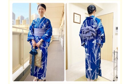 盆踊りイベント参加前に着付けレッスン・爽やかな青紫色の浴衣をお召しになって
